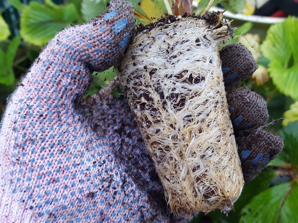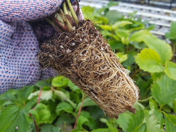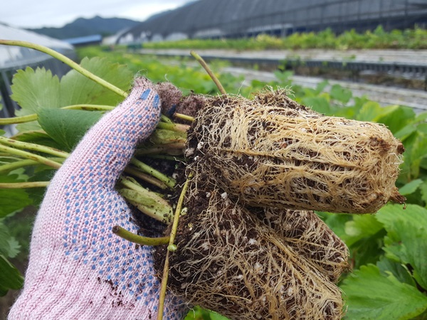 여름내 정성껏 기른 딸기모종 뽑아서 심고 있다.