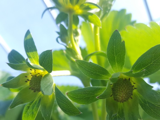 이미 하얀 꽃잎이 떨어져서 수정이 된 딸기꽃도 보이고
