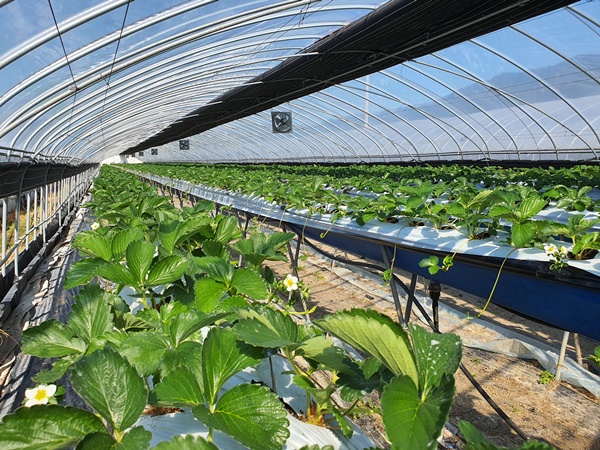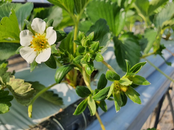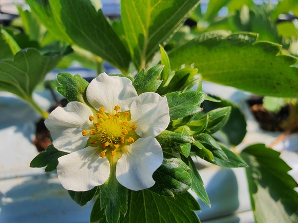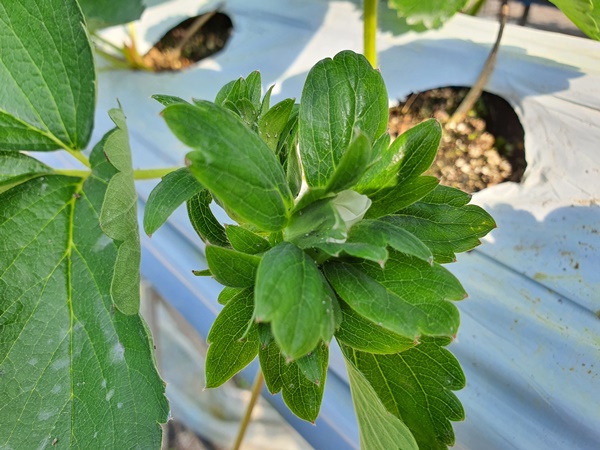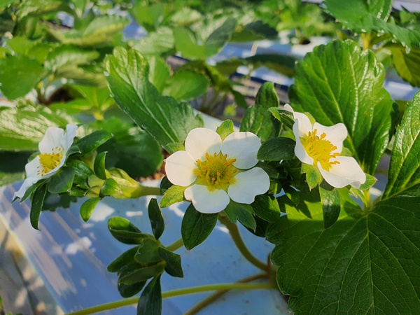 2020년 10월 11일요즘 딸기하우스안에는 얼마전에 심어놓은 딸기모종노엽을 제거하고 새로나온 잎만 남겨둔다.어느새 혼자힘으로 잘 지탱하고 있는 딸기모들정말 대단하다.벌써 하얀 딸기꽃들도 보인다.딸기꽃을 한껏 품고 있는 꽃대들도 보이고딸기꽃들이 앞다투어 피어나고 있습니다.1햇살안에 새로운 잎들이 반짝반짝 윤기가 도네요.조만간 이곳에 빨간 딸기가 주렁주렁 열릴겁니다.