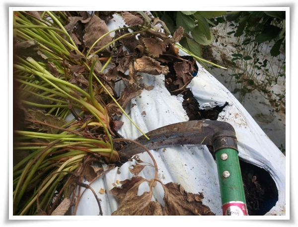 그동안 딸기수확을 한 딸기모들을 이렇게 낫으로 깨끗이 잘라주어야 합니다.