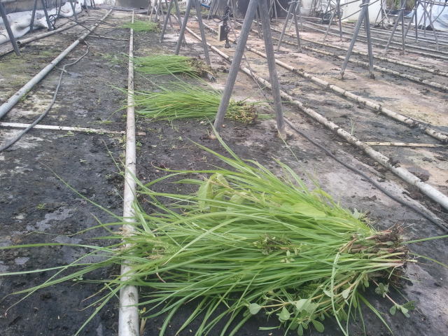 하우스 바닥에 천을 깔지만 그래도 이렇게 잡초들이 뚫고 올라온다..