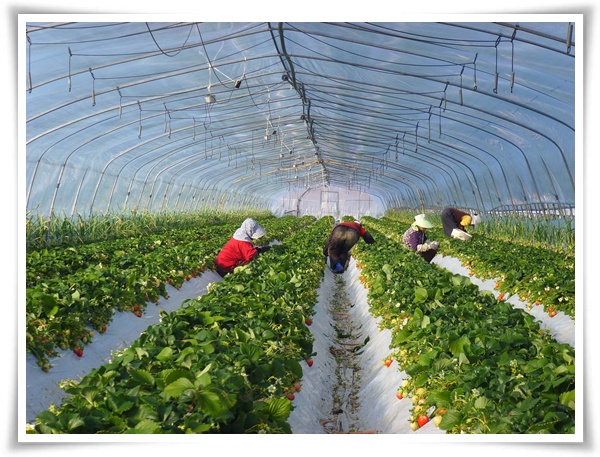 토양에서 재배하는 딸기하우스에 4명의 아주머니께서 딸기꽃을 솎고 계신다.