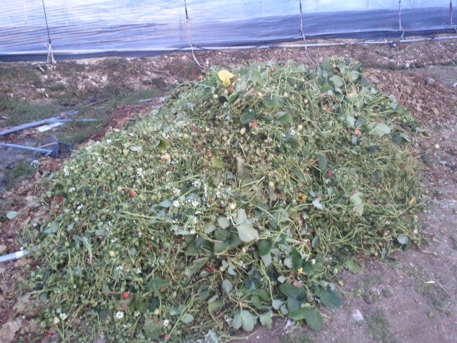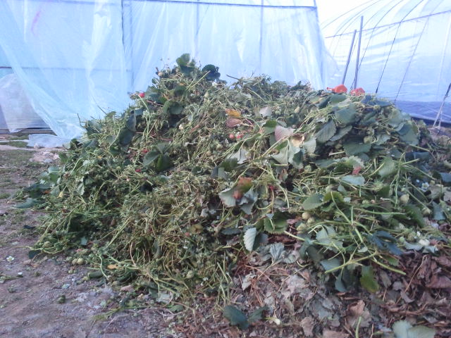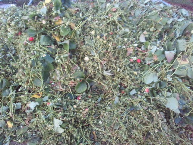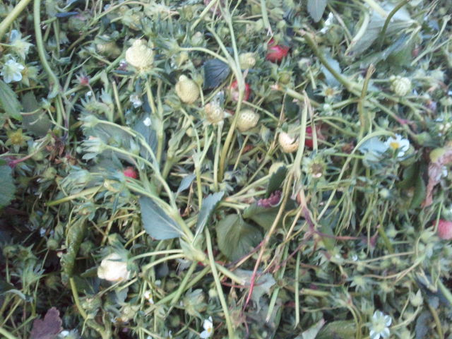 오늘 솎아낸 딸기들과 딸기 잎들입니다.