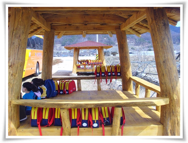 딸기체험을 온 어린이집 천사들처럼 작은가방들이 줄을 서 있는 모습이