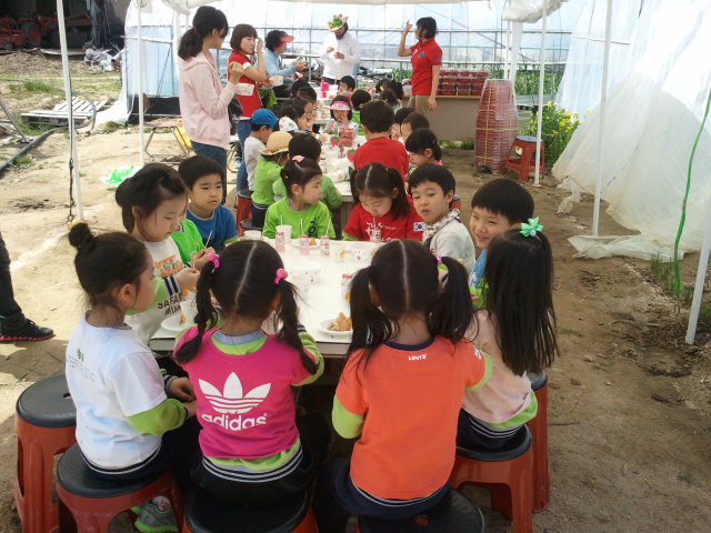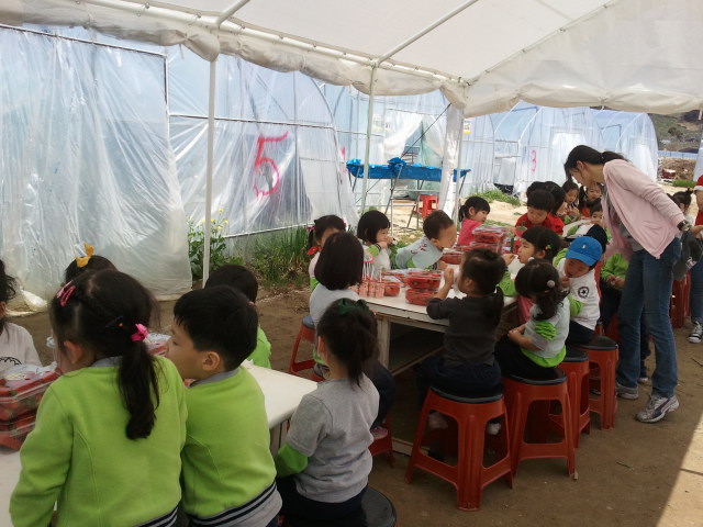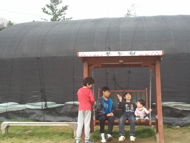 딸기를 따고 나온 아이들은 시원한 그늘에서 휴식을 취하고 있군요.