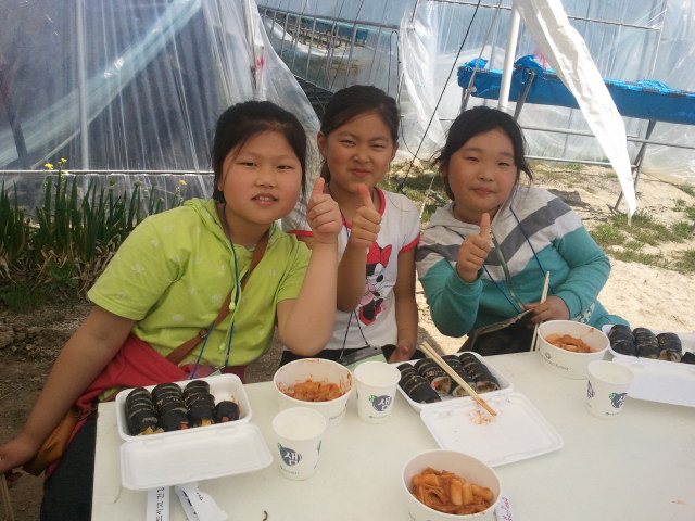 딸기따기체험을 마친 여자친구들이 쪼르르 달려와