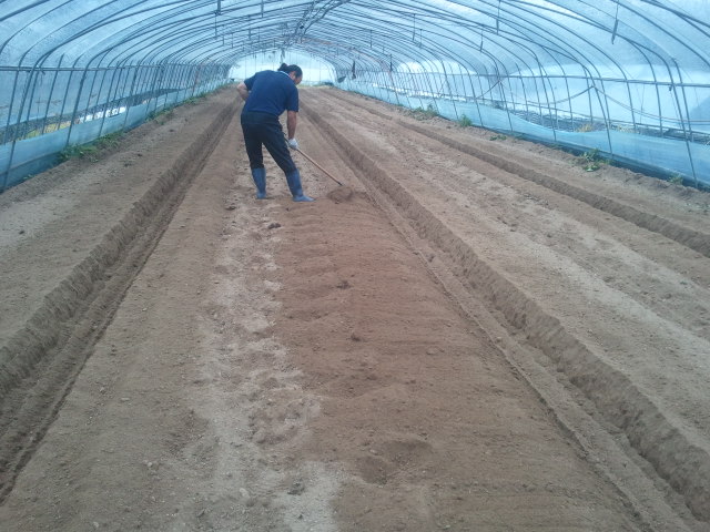 그래도 이렇게 사람손으로 일일이 흙을 고르고 펴는 작업을 하여야 한다.