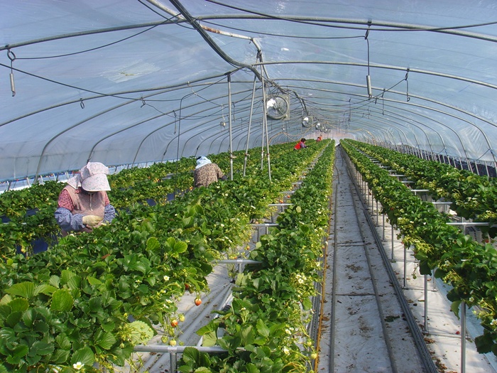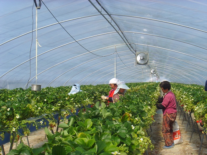 딸기꽃솎기랑 노엽제거 작업을 하고 있습니다.
