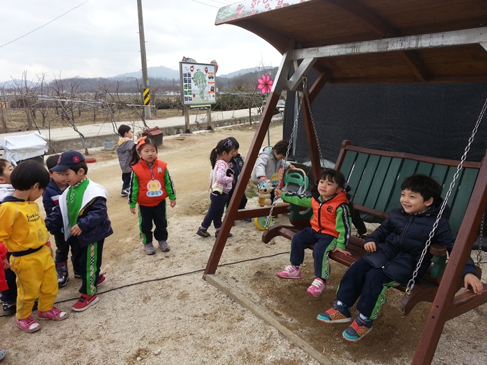 딸기따기 체험을 마치고 나온 아이들은 나무그네를 신나게 타고 놉니다.
