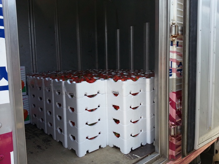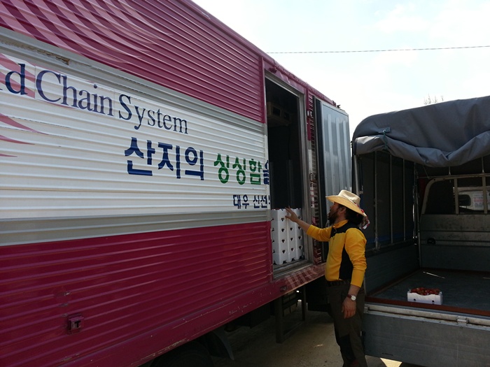 백화점에서 온 차에 포장한 딸기를 실어보내고