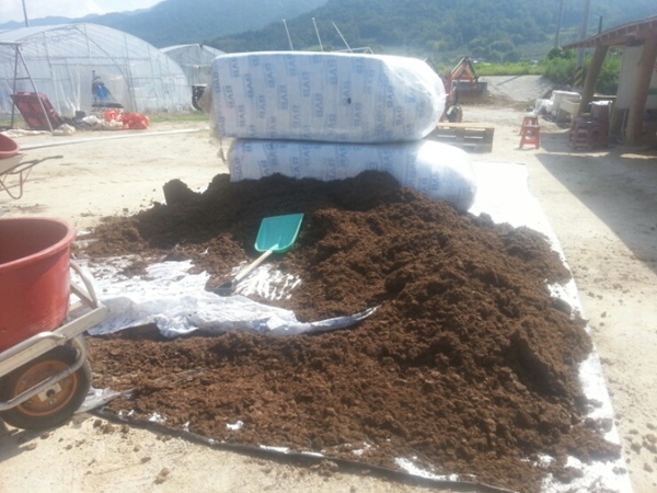 잘게 부순 상토를 큰 다라이에 담아서 새로운 상토를 보충해주고 있다.
