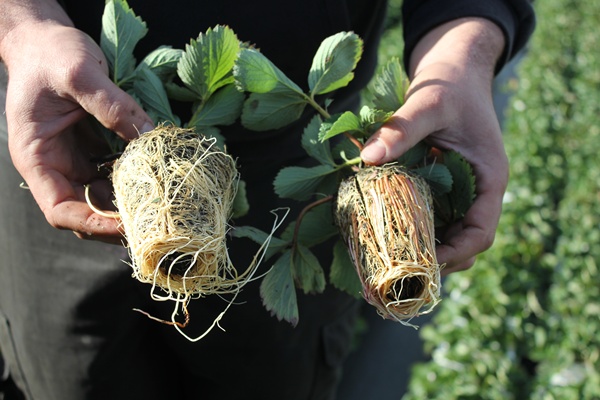 딸기모종 뿌리를 비교하는 모습