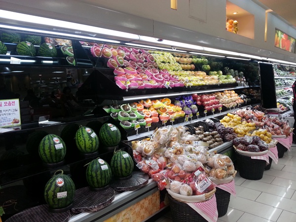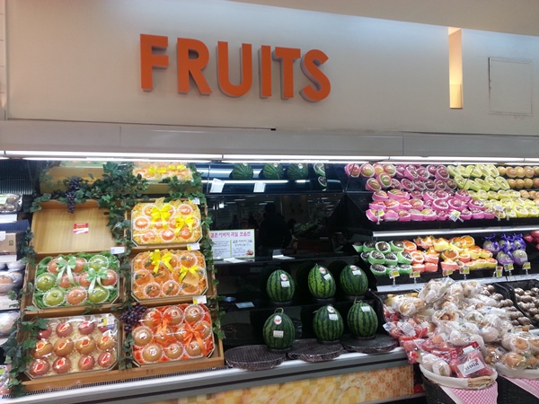 백화점 농산물 코너에 최고급 과일들이 자리를 잡고 있네요.