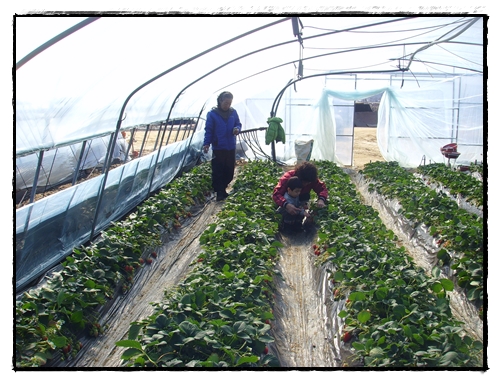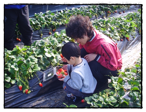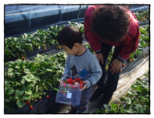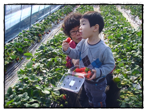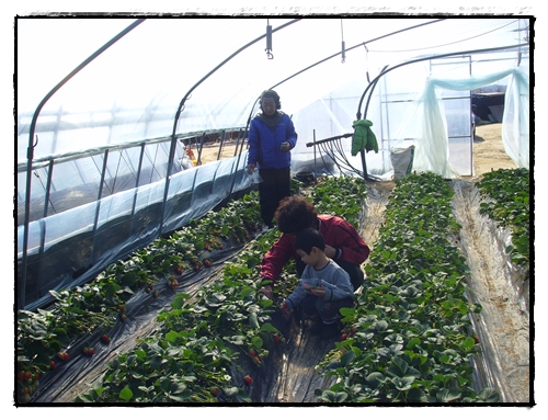 할머니가 자상하게 딸기따는법을 가르켜주시고...