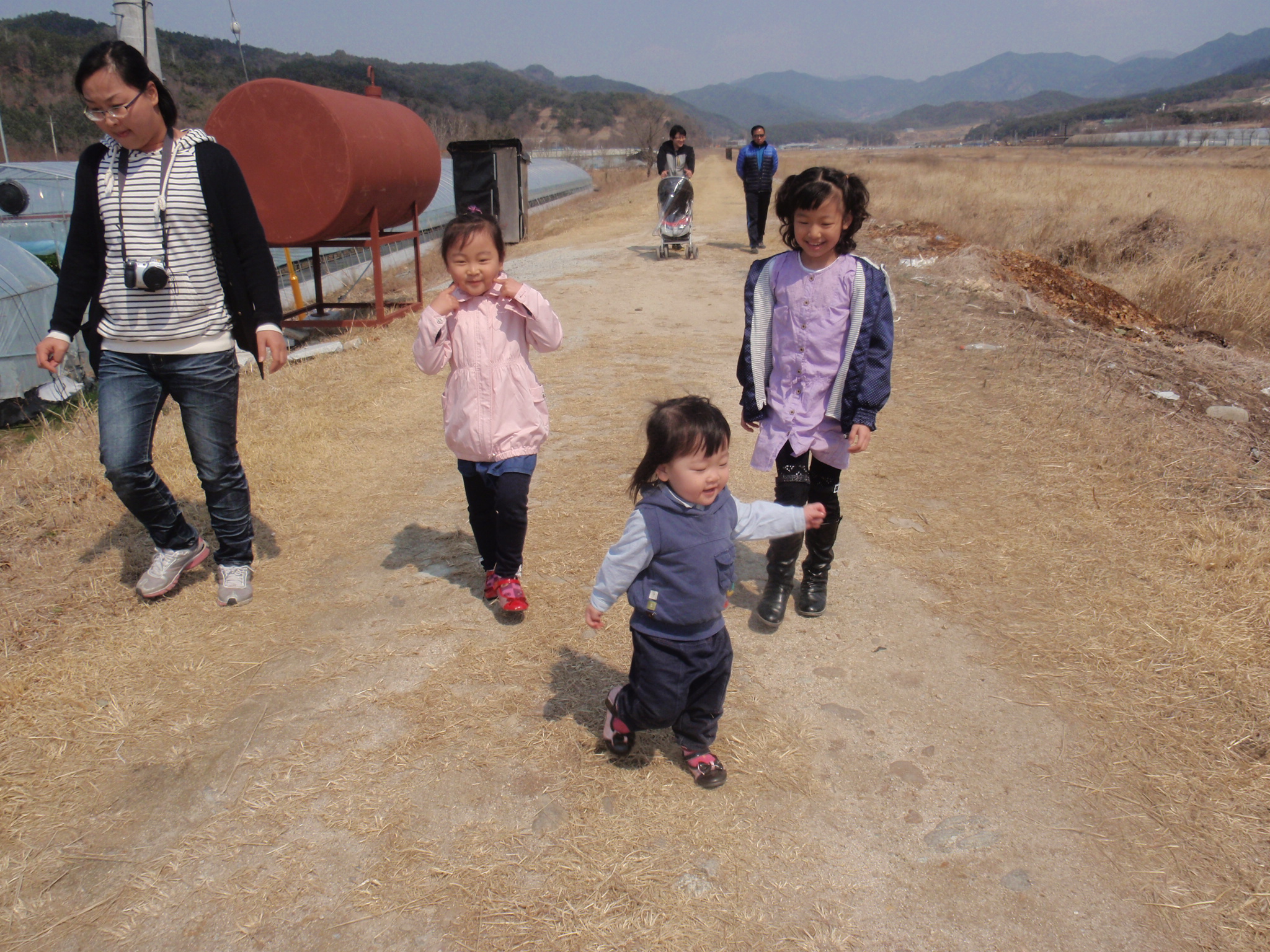 딸기를 너무 많이 먹었다고 하우스옆으로 난길을 산책하고 있어요~~