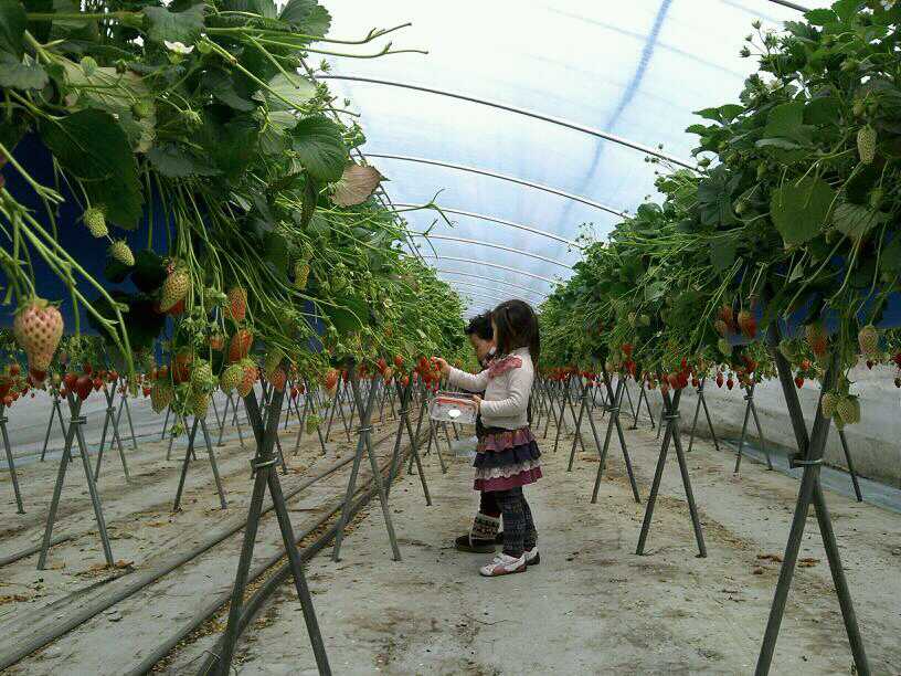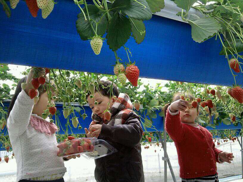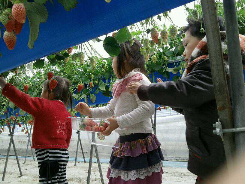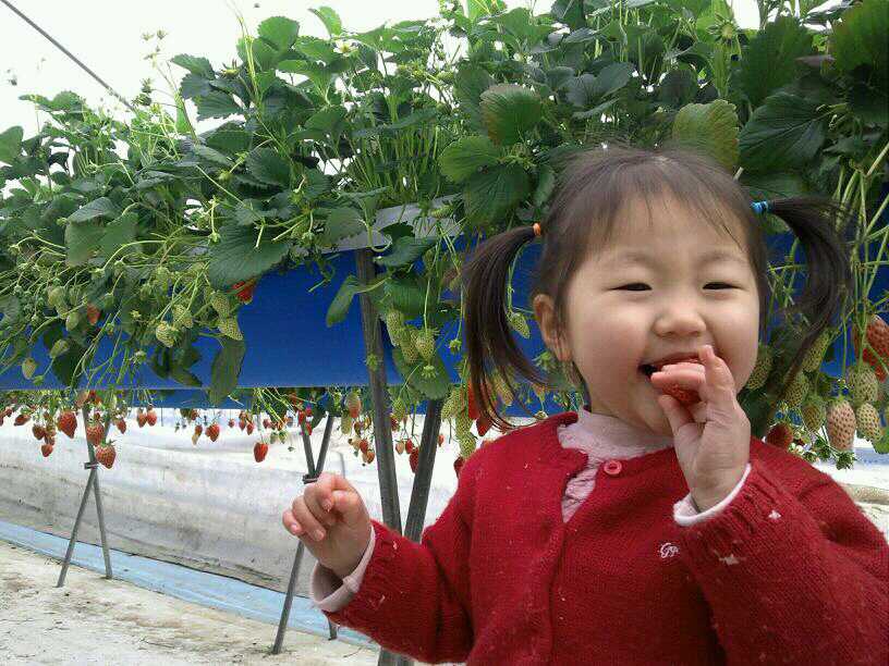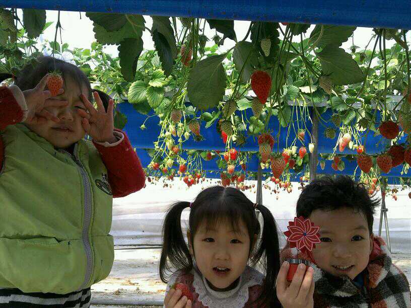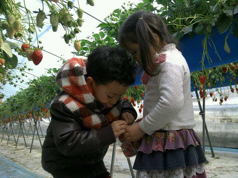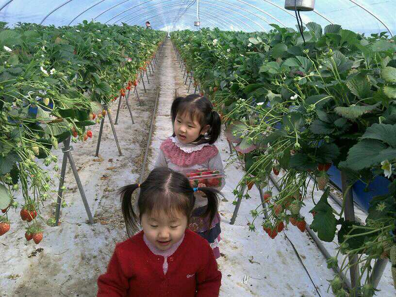 첫째는 딸기 따는 재미에, 맛도 안보고 계속 따기만 하네요!