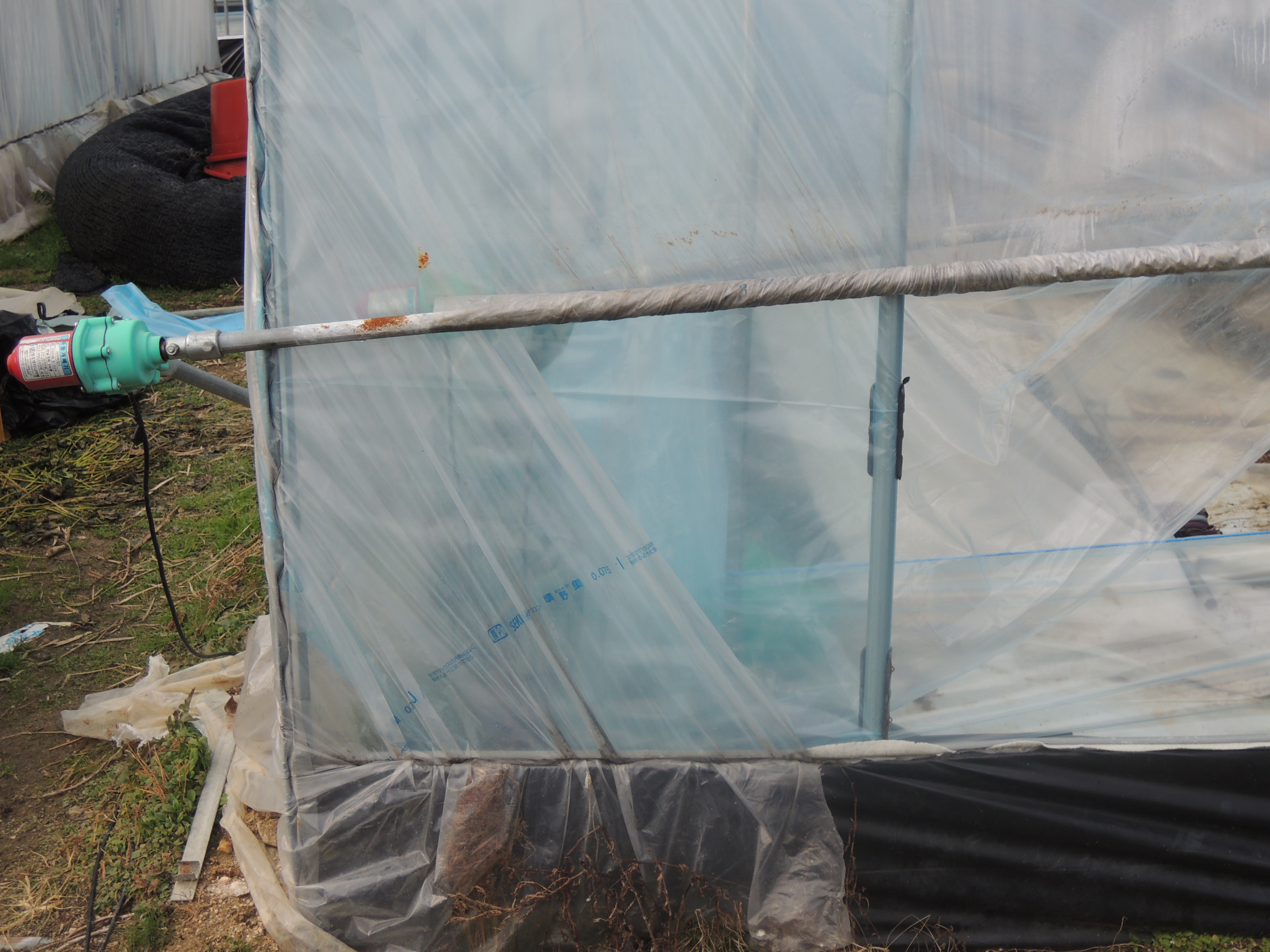 측창앞부분(개폐기쪽과 반대쪽)에 빈틈이 있는데 그곳을 다시 비닐을 덧대서 새는 바람을 차단시킵니다. 겨울철 하우스 보온은 바람차단이 우선입니다.